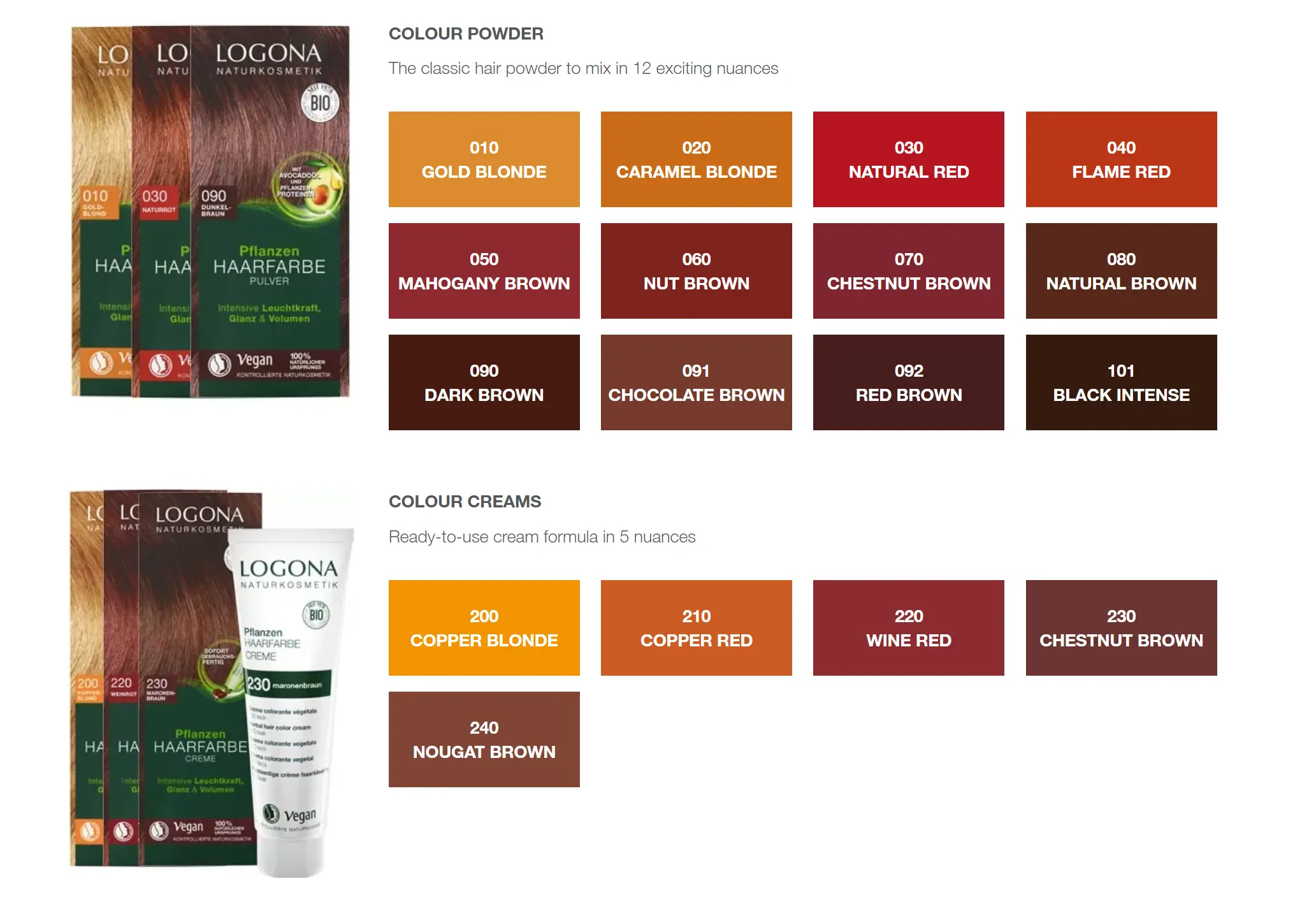 Logonas hårfarver fås enten i pulverform eller som en creme, der er let at fordele i håret. Cremefarverne er lette at bruge og har også en bedre dækning af grå hår. Du skal forvente at farven altid vil blive lysere på gråt hår. Farverne dækker 30% på gråt hår. Se farvekort her.