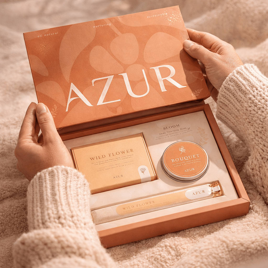 BLOOM-sættet samler tre af Azurs bestsellere i en bæredygtig gaveæske med 100 % naturlige ingredienser og opløftende æteriske olier.