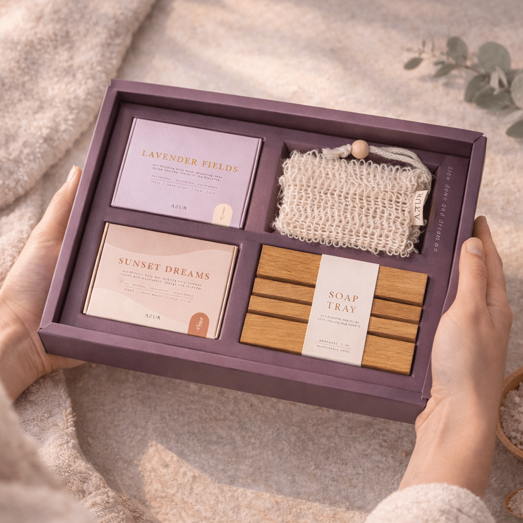 I sættet for du 2 duftende og plejende faste sæber, sæbepose og en elegant sæbeskål i mørkt træ – smukt pakket og klar til at give som gave eller til at stå stilfuldt fremme på badeværelset.