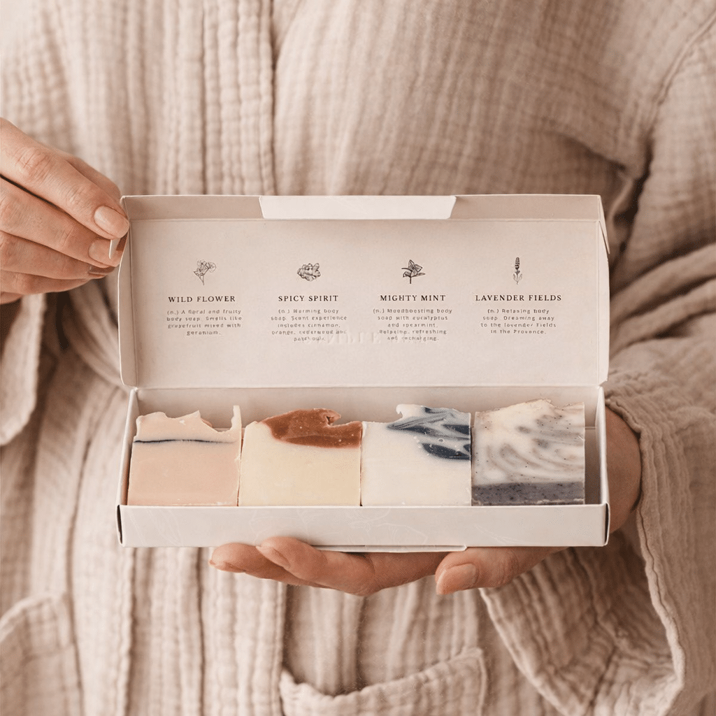 En sanselig kollektion af fire håndlavede body bars samlet i én smukt designet gaveæske.