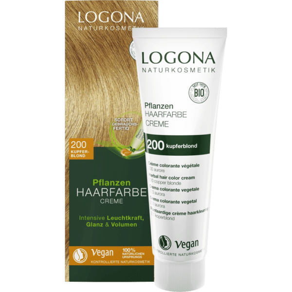 Logona hårfarve Kobberblond er en urtebaseret hårfarve, der er særligt skånsom. I modsætning til kemiske hårfarver, ødelægger farven ikke hårets naturlige struktur. Sammensætningen af økologisk henna pulver og andre plantebaserede farvestoffer samt økologisk avocadoolie, giver strålende farve, glans og volumen.