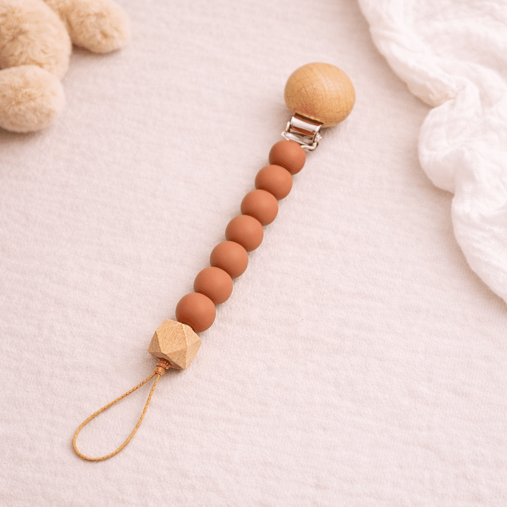 Suttekæde fremstillet i 100% fødevaregodkendt silikone, som er blød, fleksibel og behagelig for barnet at røre ved.