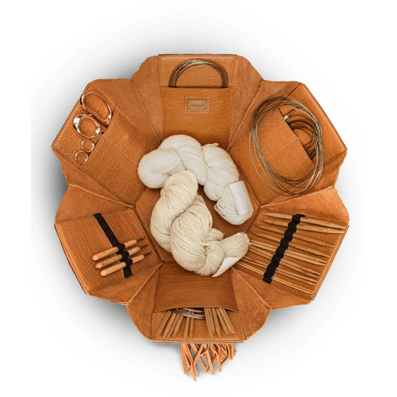 Når du løsner den fine læderstrop, åbner boksen sig op og afslører praktiske inderlommer, der holder styr på dine strikkepinde, broderigarn og småredskaber. Alt har sin plads – så du nemt kan fordybe dig i dit kreative projekt.