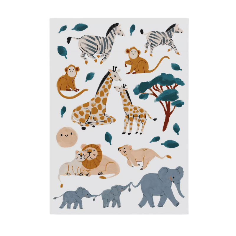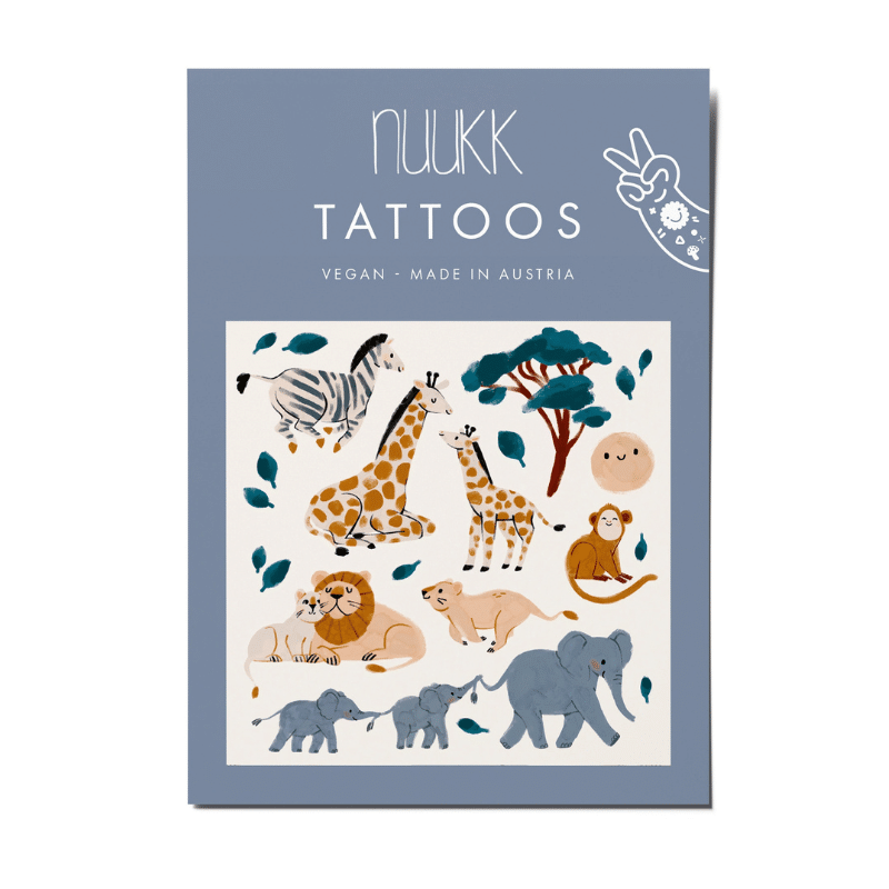 Safari-børnetatoveringer fra Nuukk bringer den afrikanske savanne direkte ned på børnehud! De fine, akvarelmalede motiver viser søde zebraer, aber, løver, giraffer og elefanter 🐒🦁🐘 – kærligt illustreret og pakket helt uden plastik.