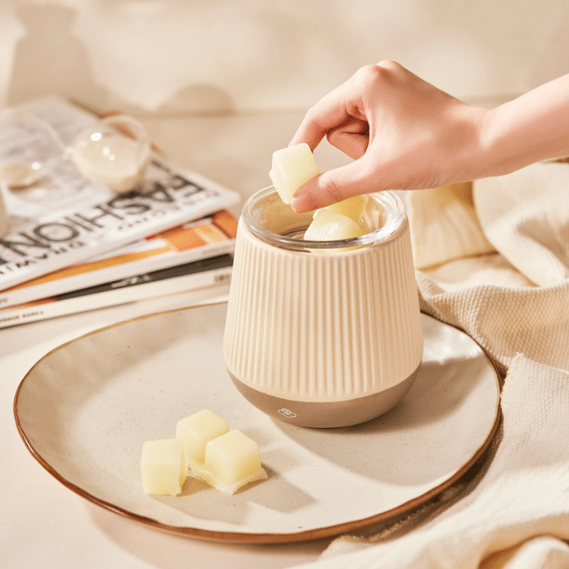 - Placer op til 45 g vokssmelt i den medfølgende glasskål.